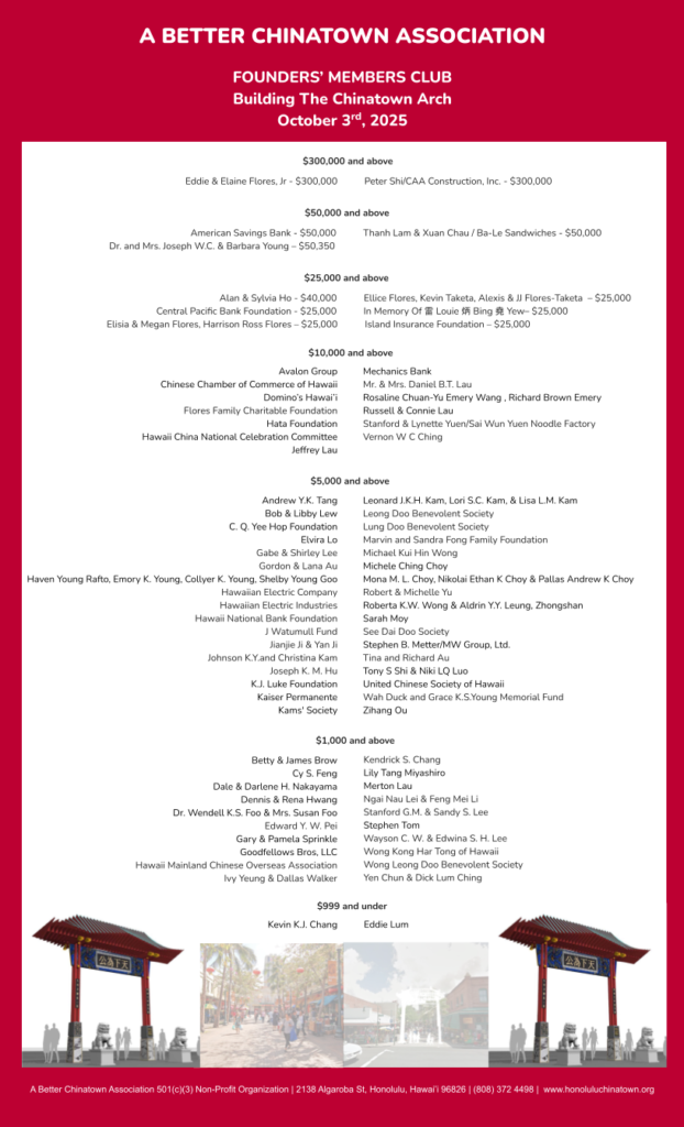 A Better Chinatown Association (ABCA) is a 501 (c) 3. Your donation is tax deductible. Our goal is to raise $1,200,000 to build two Chinatown arches at Kekaulike Mall.  The first arch will be built in 2026 at Kekaulike and King. The second arch will be built 2028 or sooner. The mission of ABCA is to promote economic development and activities for the merchants of Chinatown and to assist the City to provide a safe and clean Chinatown for tourists and local people.