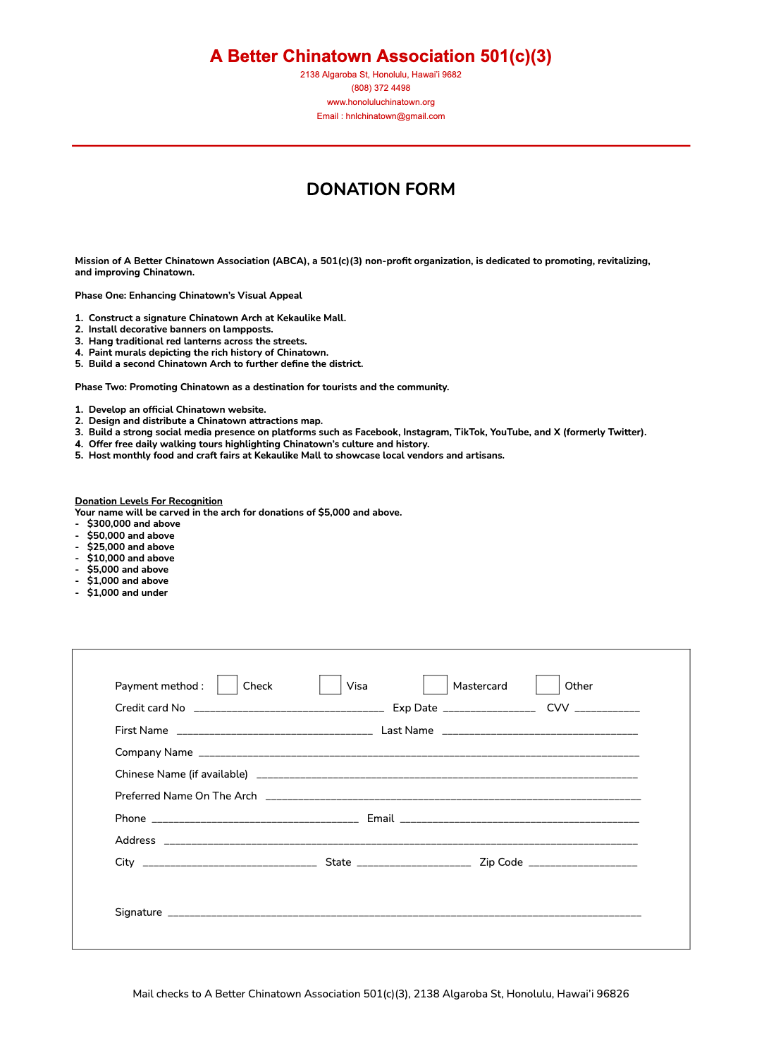 A Better Chinatown Association (ABCA) is a 501 (c) 3. Your donation is tax deductible. Our goal is to raise $1,200,000 to build two Chinatown arches at Kekaulike Mall.  The first arch will be built in 2026 at Kekaulike and King. The second arch will be built 2028 or sooner. The mission of ABCA is to promote economic development and activities for the merchants of Chinatown and to assist the City to provide a safe and clean Chinatown for tourists and local people.